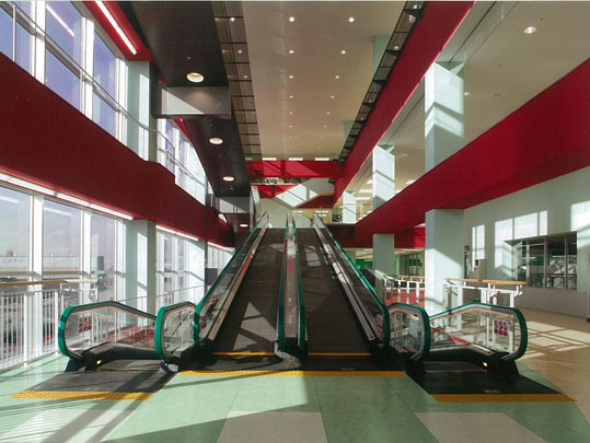外観については、東西に約130m、南北に約100mの巨大な建物であり、圧迫感を緩和し、且つ、店舗内の賑わいを見せる為、南東の建物コーナー部に長さ約80m,高さ約20mのカーテンウォールを設けた。又、車での来店客の安全や渋滞に対するストレスを感じさせない様、駐車動線に配慮し、4箇所のスロープにて場内駐車場の出入庫を行う。