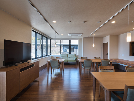 1ユニットは10人の入居者の生活の場となる。食事や団らんのために集まり過ごす共同生活室をあえて道路に面した位置に計画した。明るく、山の緑が遠望でき、風が抜け、隣のユニットの生活が垣間見え、また、街の様子も伺える。施設の中からも外からもお互いの気配を感じることができる。